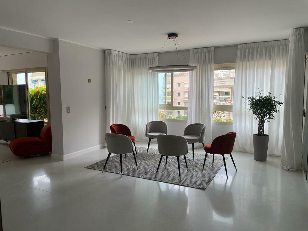 Si compone di un ingresso, un doppio soggiorno/sala da pranzo, una camera matrimoniale con bagno e spogliatoio, 2 camere da letto, un secondo bagno, una cucina indipendente completamente attrezzata e attrezzata, un bagno per gli ospiti, una grande terrazza con alberi che offre una piccola vista sul mare.
