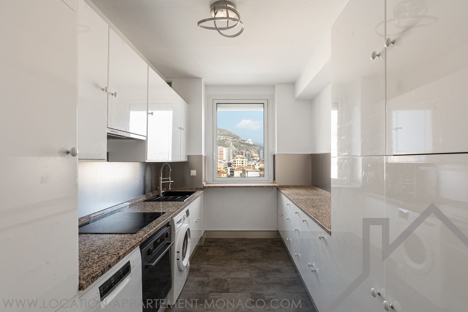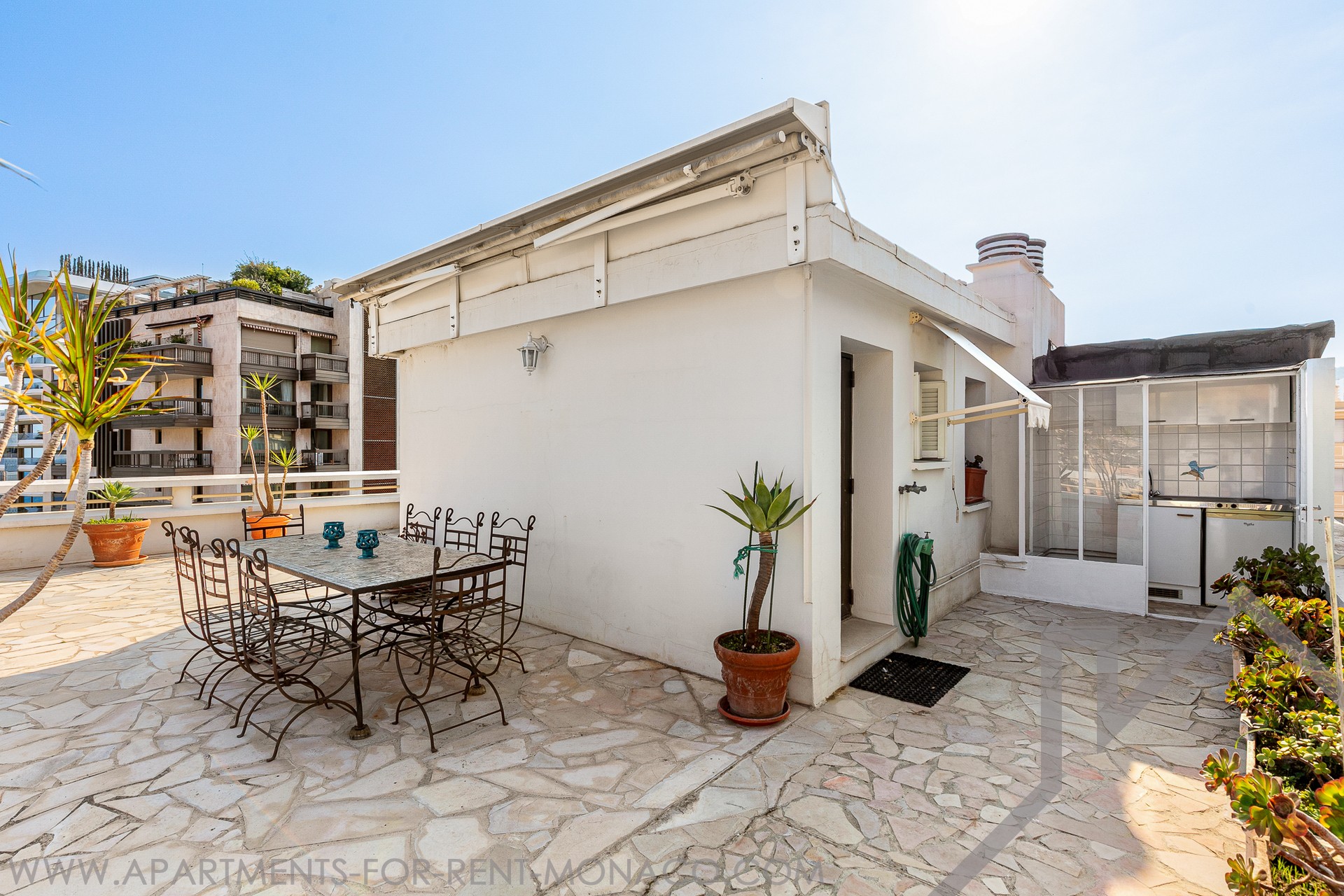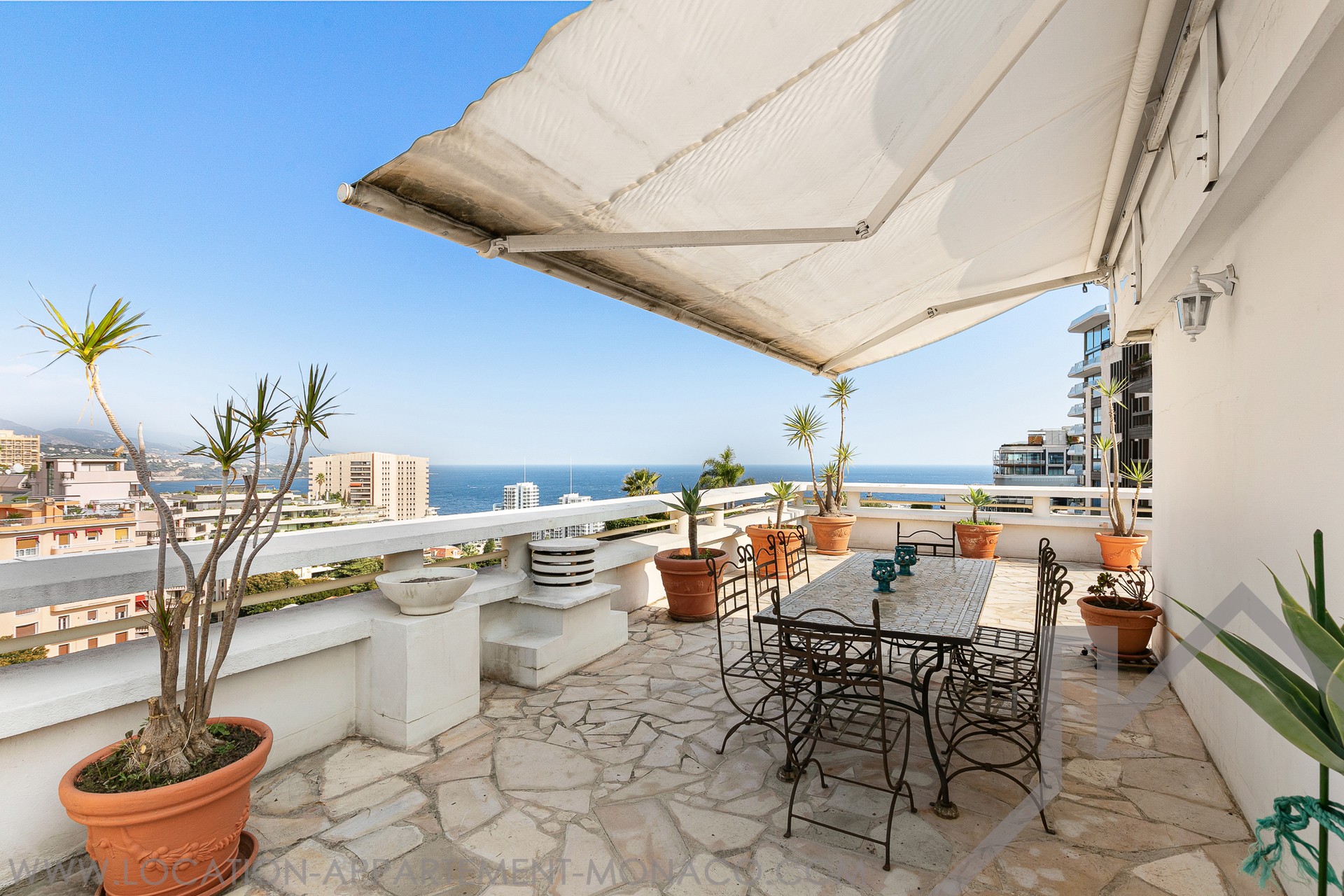 Questa incredibile terrazza di 107mq senza contatto diretto, vanta una vista panoramica a 360° sul Principato e comprende un angolo cottura estivo e una zona pranzo con tende elettriche esterne.