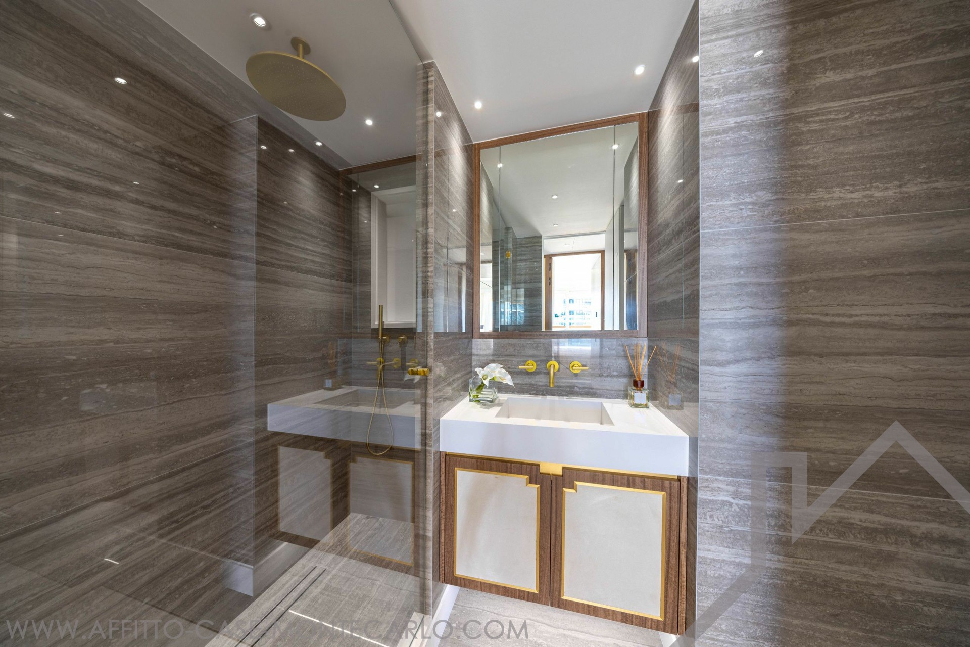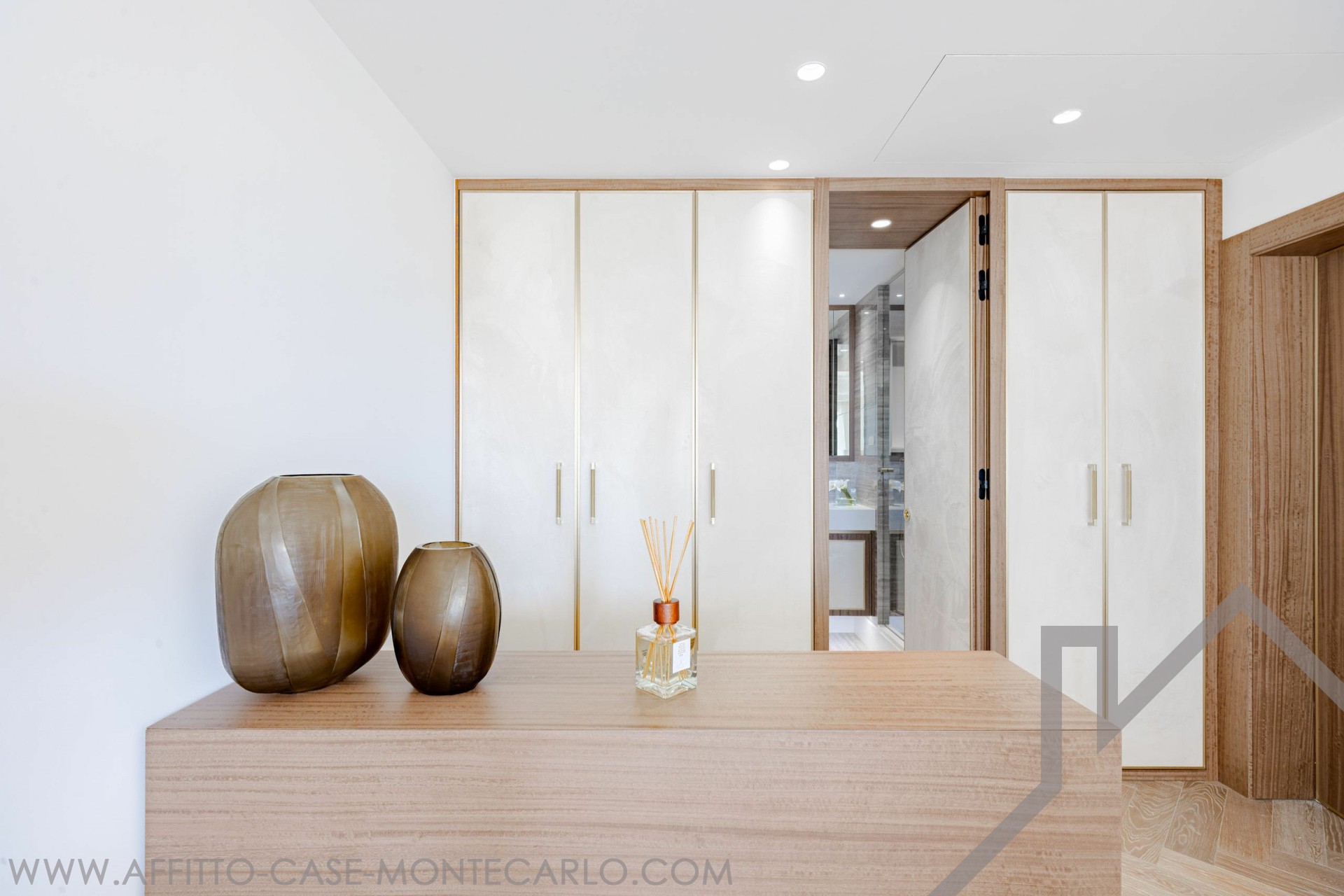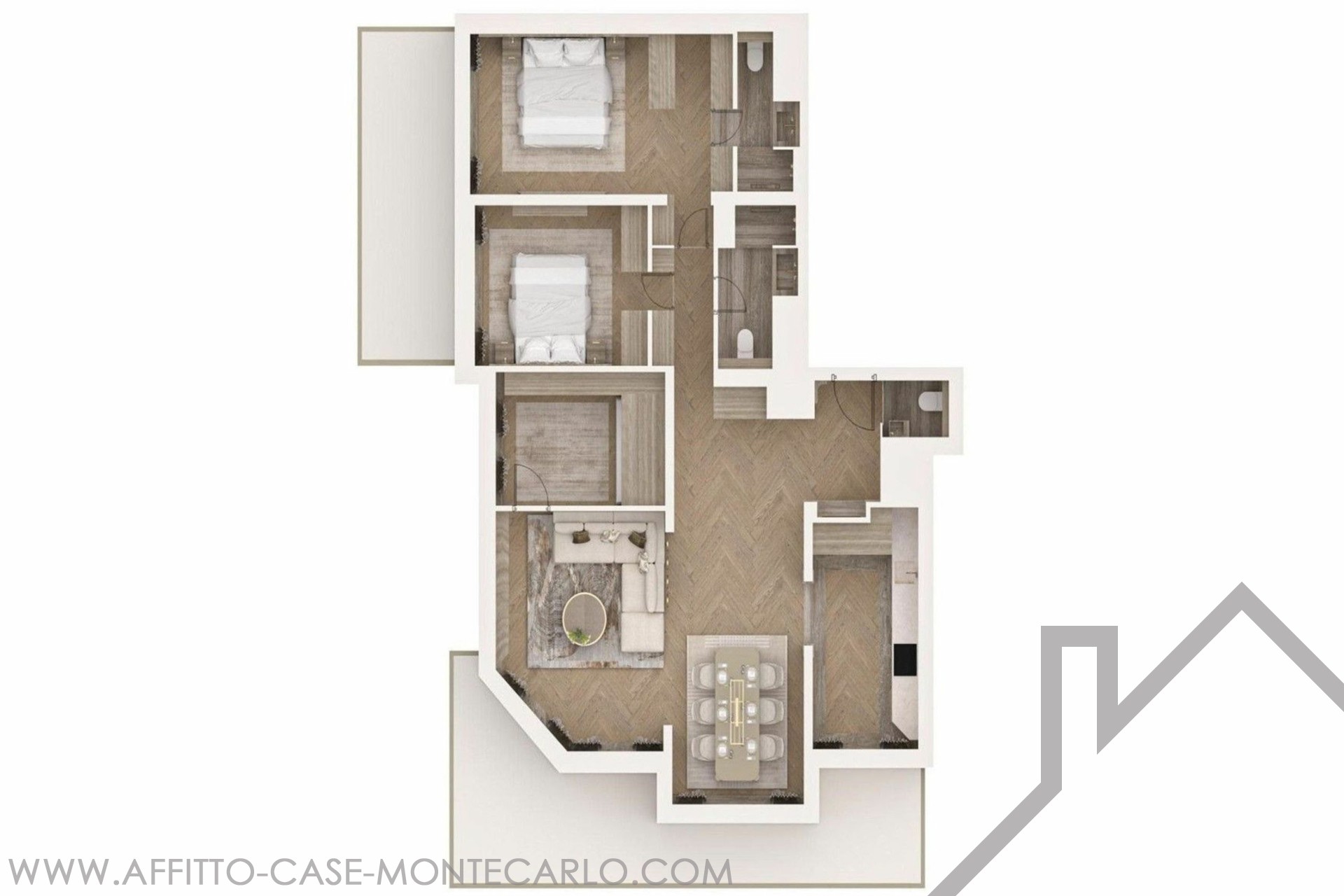L'appartamento è composto da due camere da letto, ognuna con bagno privato, uno studio che può essere trasformato in una camera da letto, una cucina indipendente completamente attrezzata, un soggiorno con sala da pranzo e un bagno per gli ospiti. 1 posto auto Affitto mensile 29.500 € + spese