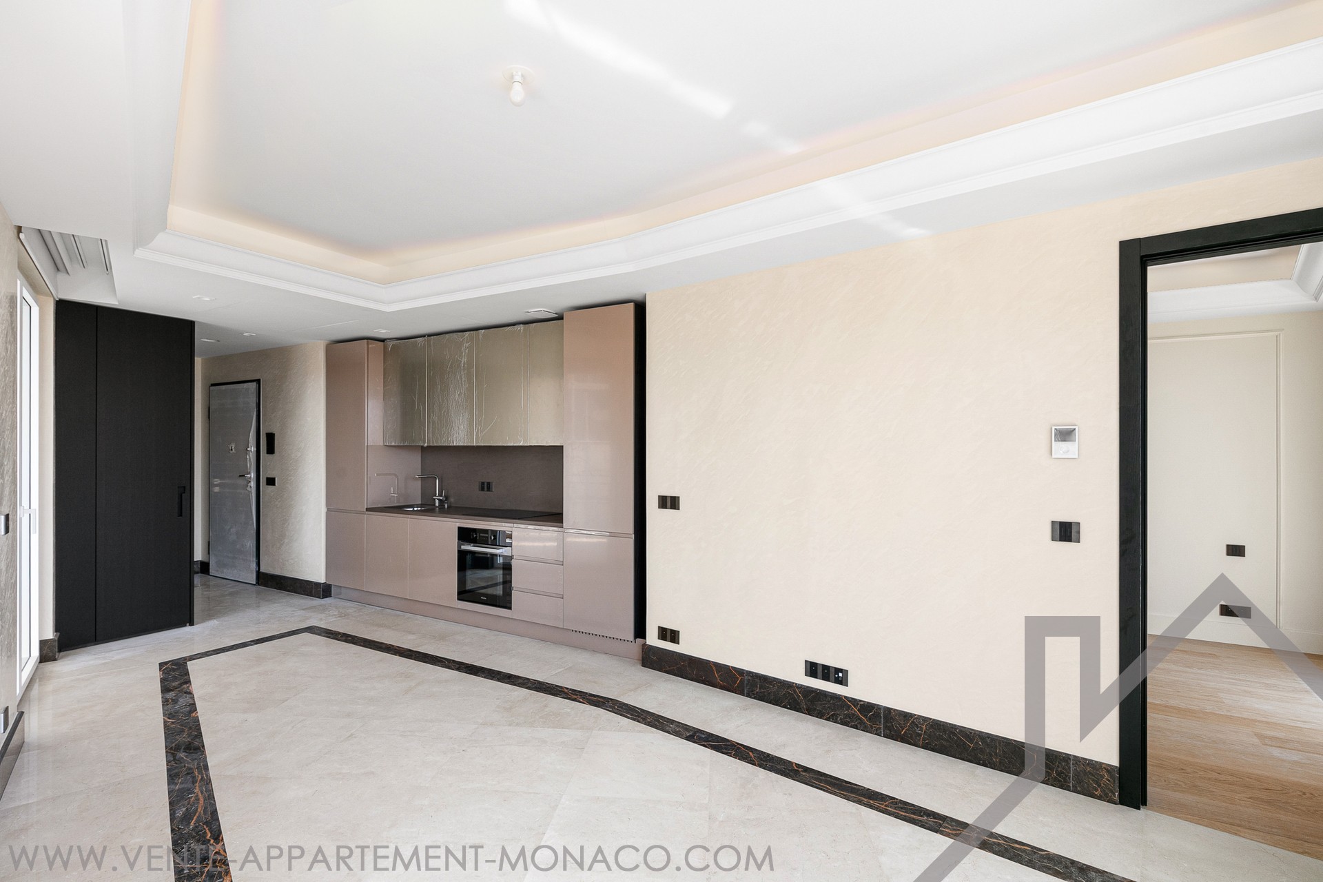 Rifinito in modo eccellente, l'appartamento comprende un ingresso con armadio a muro e illuminazione interna, un bagno per gli ospiti con specchio e lavabo su misura, un soggiorno luminoso e arioso con due diversi pavimenti in marmo, pareti stuccate e una cornice illuminata sul soffitto.