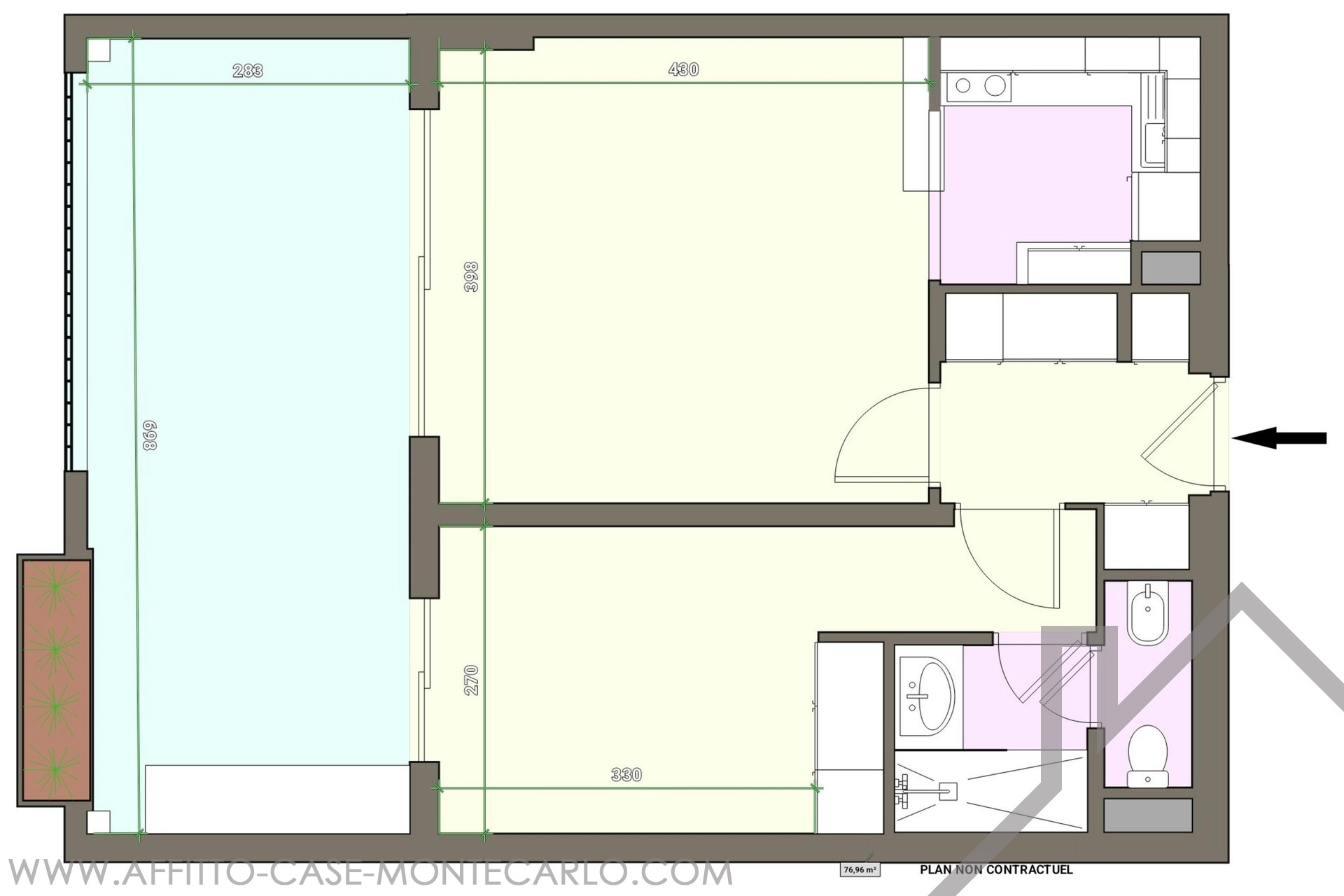 Piacevole e molto ben organizzato, l’appartamento è composto da un ingresso, un soggiorno con cucina a vista completamente attrezzata, una camera da letto con il suo bagno completo e numerosi armadi. Il soggiorno e la camera da letto si aprono su un’ampia terrazza che gode di una bellissima vista sul mare e sulla piscina della residenza.