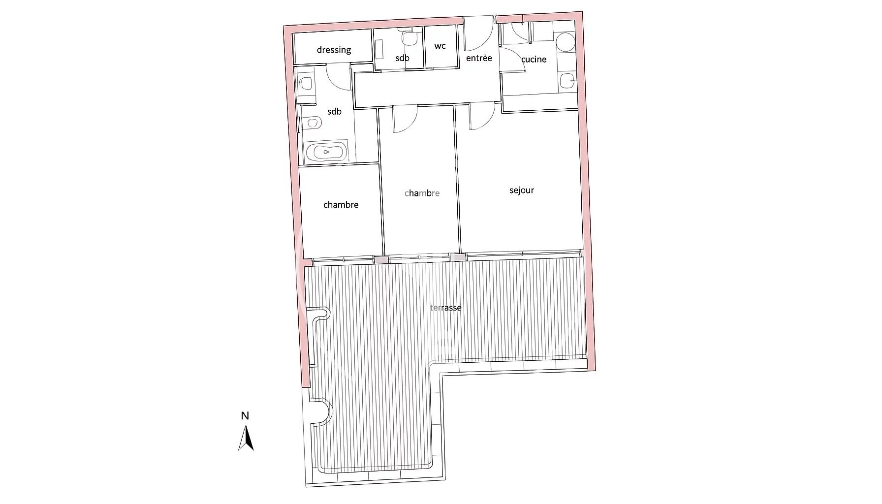 L'appartamento è suddiviso come segue: un atrio d'ingresso, una cucina completamente attrezzata con accesso al soggiorno e alla sala da pranzo. Una grande terrazza di 70 m²,