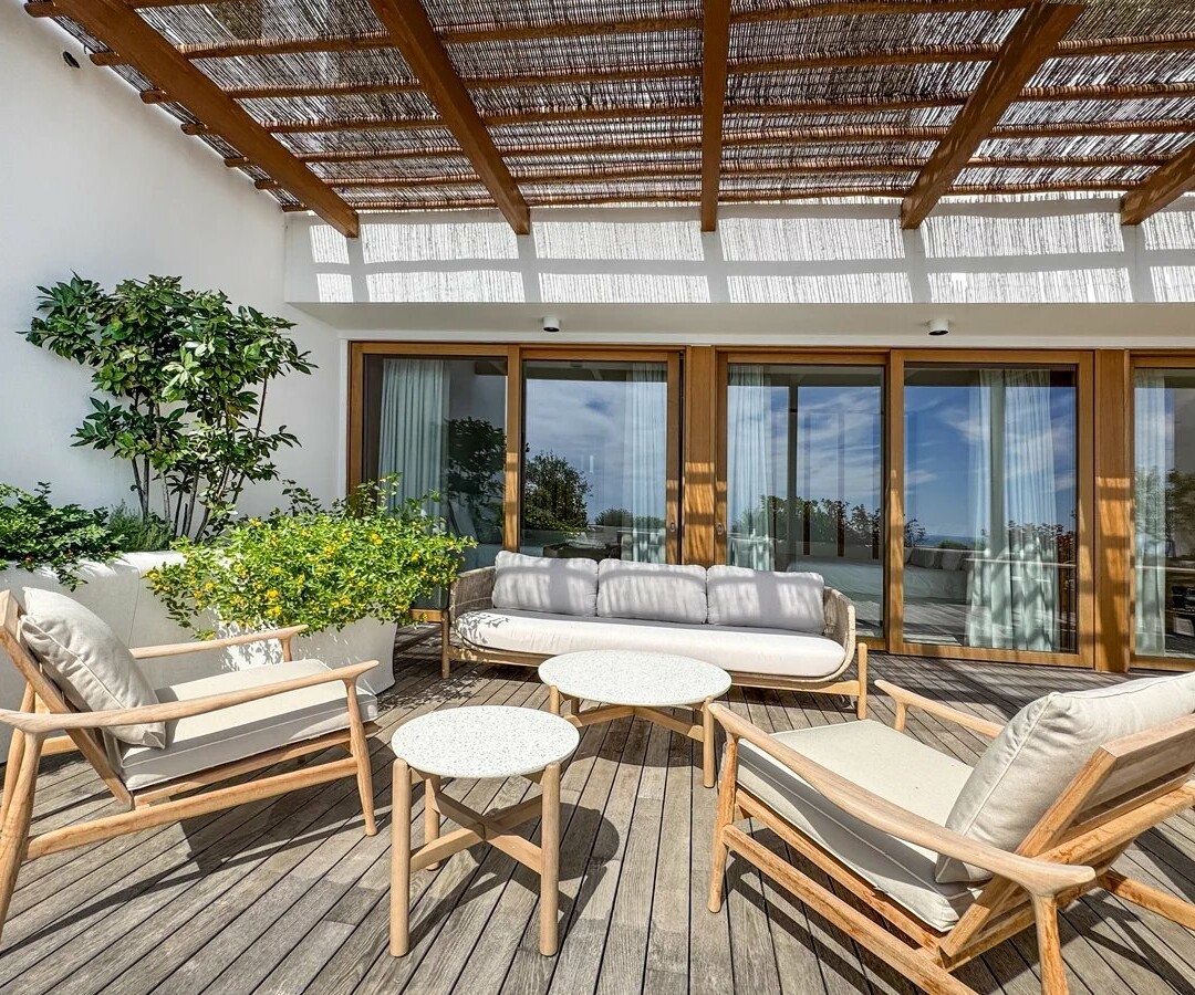 La grande terrazza con diversi lounge e un'area pranzo si estende per oltre 70 metri quadrati e offre viste panoramiche su Monaco e sul porto di Cap d'Ail.