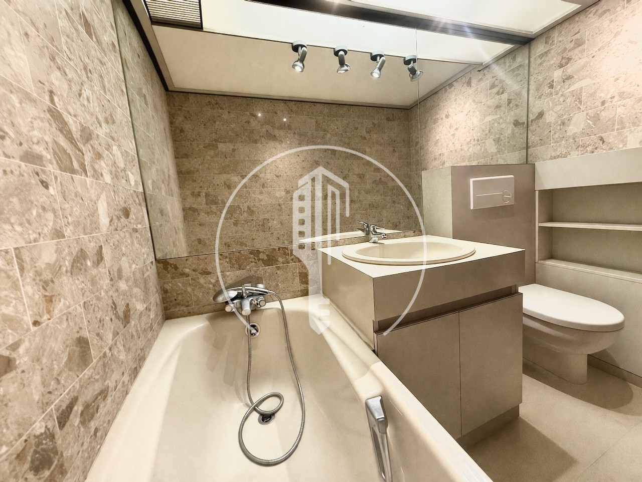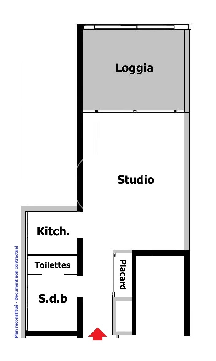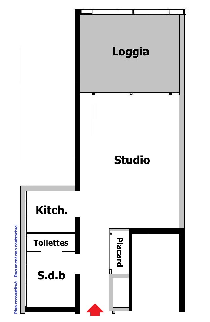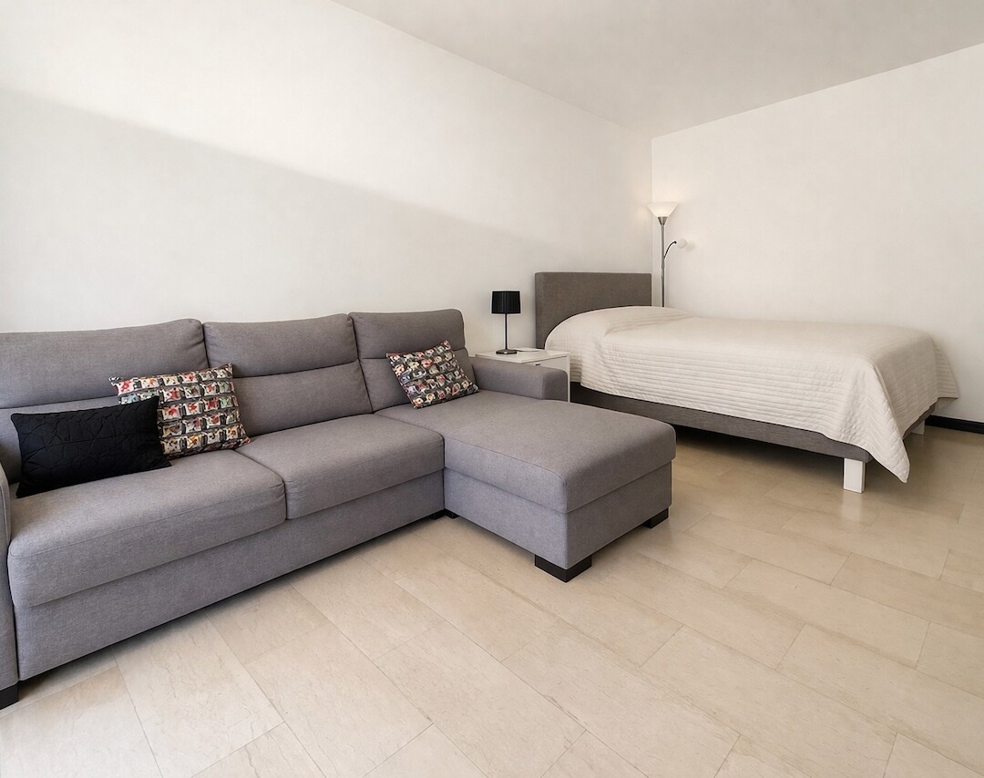 Ingresso con armadio a muro, soggiorno, kitchenette equipaggiata, bagno completo, loggia, aria condizionata, doppio vetro