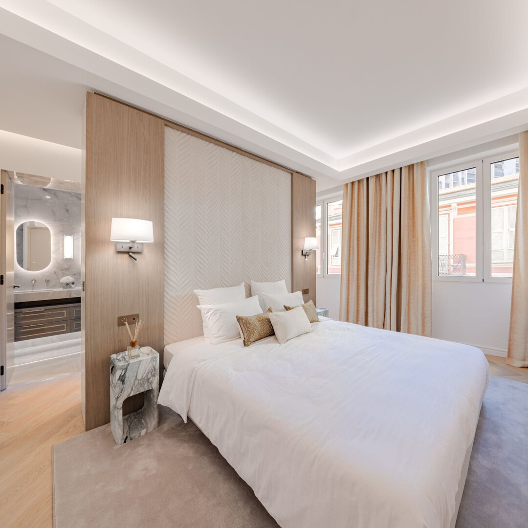 Inoltre, una cucina indipendente, completamente attrezzata e arredata, completa l'appartamento insieme a un soggiorno/pranzo luminoso grazie al balcone che si affaccia sul Carré d'Or con vista parziale sul mare.