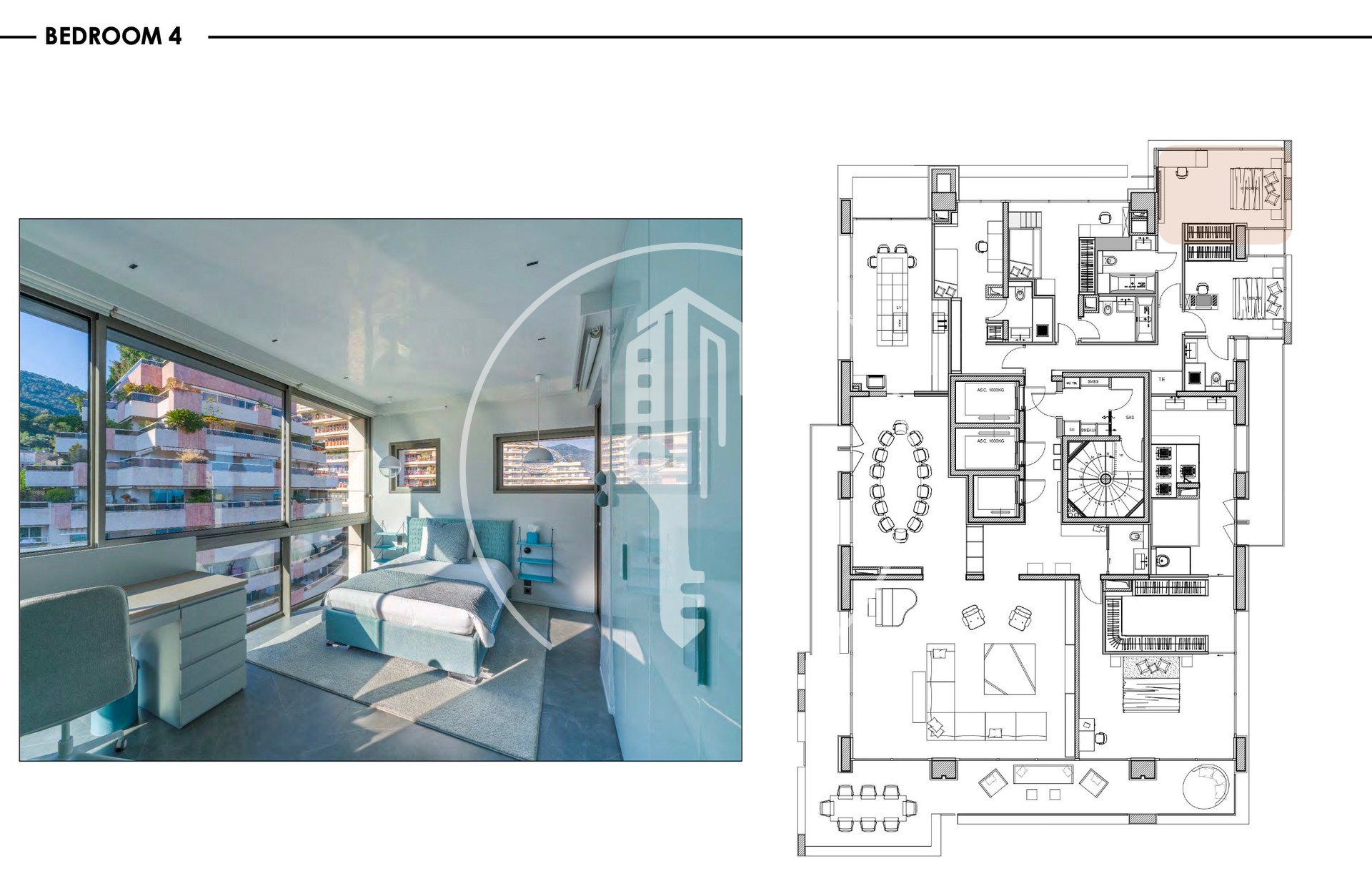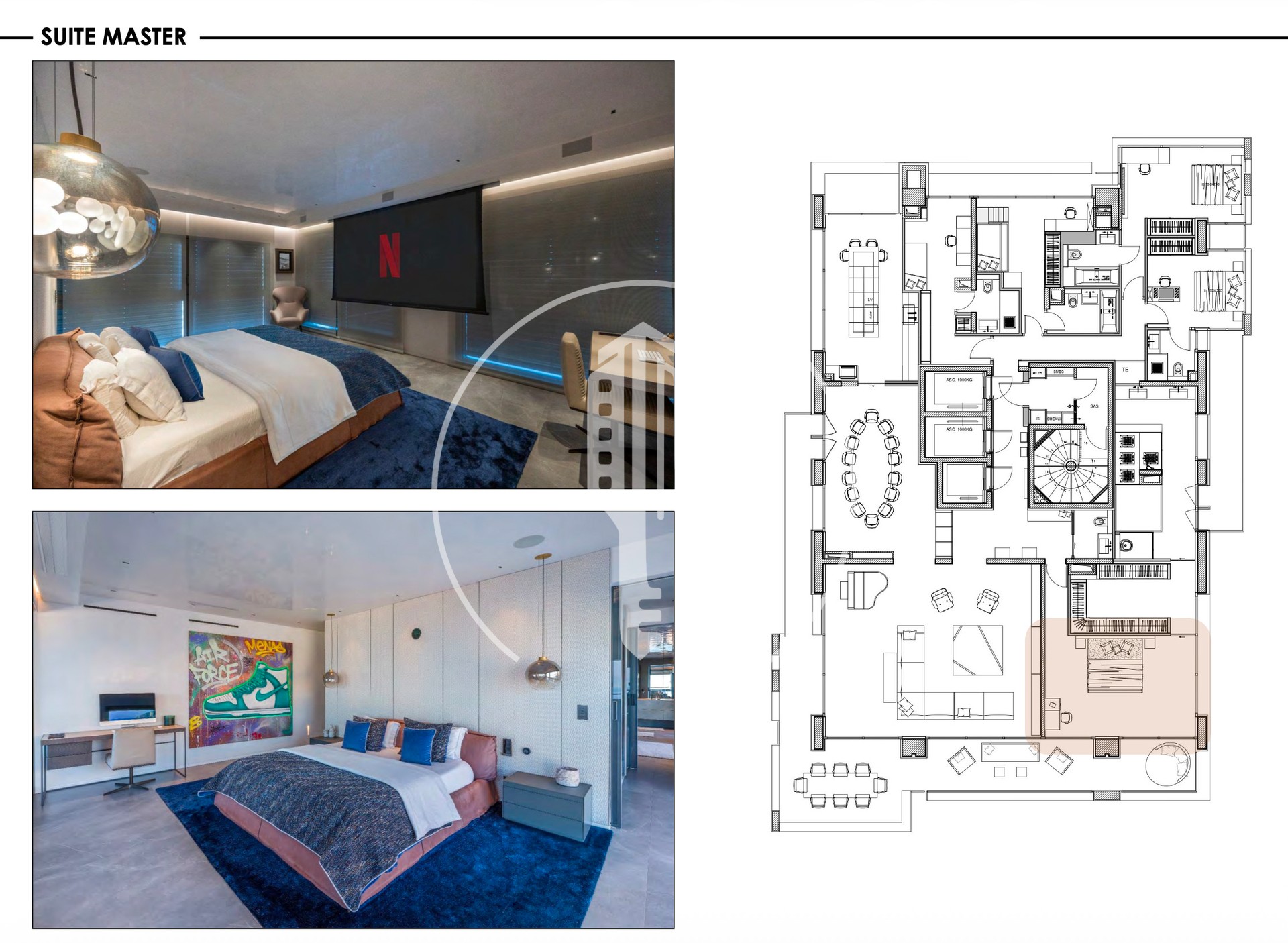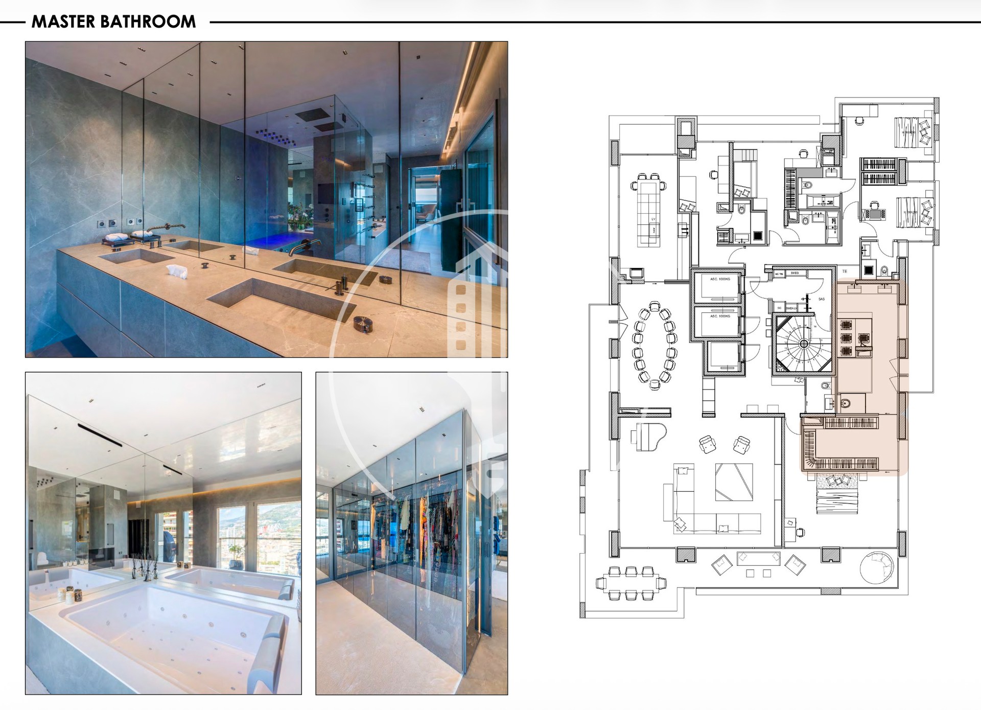 L'appartamento ha 5 camere da letto, ognuna con il proprio bagno privato. La camera da letto principale si apre su una grande terrazza e include un home cinema, un camerino doppio e una spa con jacuzzi.