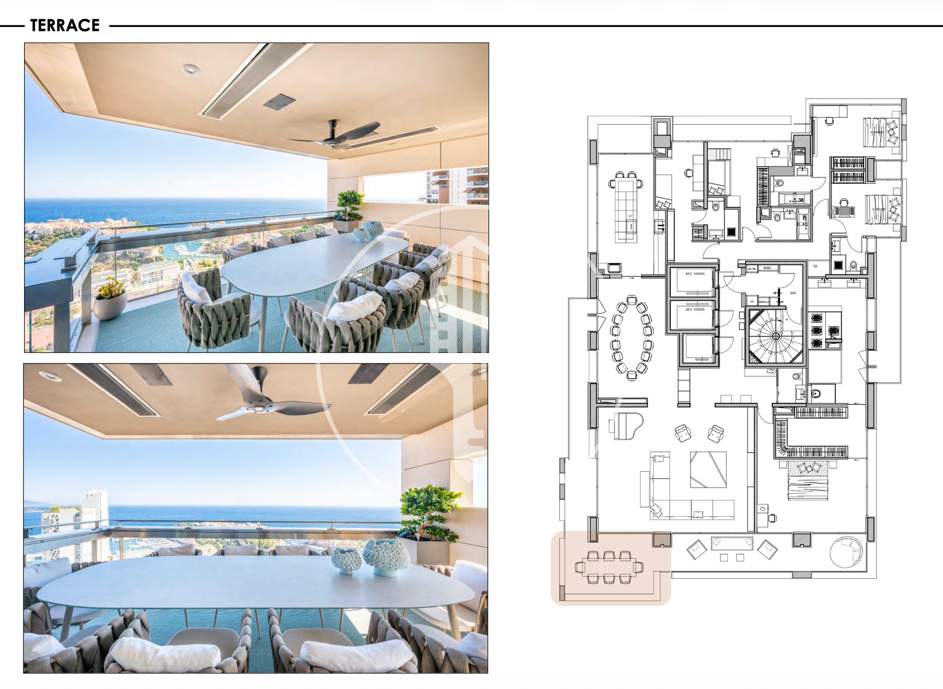 L'appartamento dispone di un ampio soggiorno con il soggiorno che si apre su una grande terrazza, offrendo una vista panoramica mozzafiato sul Principato, sul Palazzo del Principe e sull'infinito blu del Mar Mediterraneo.