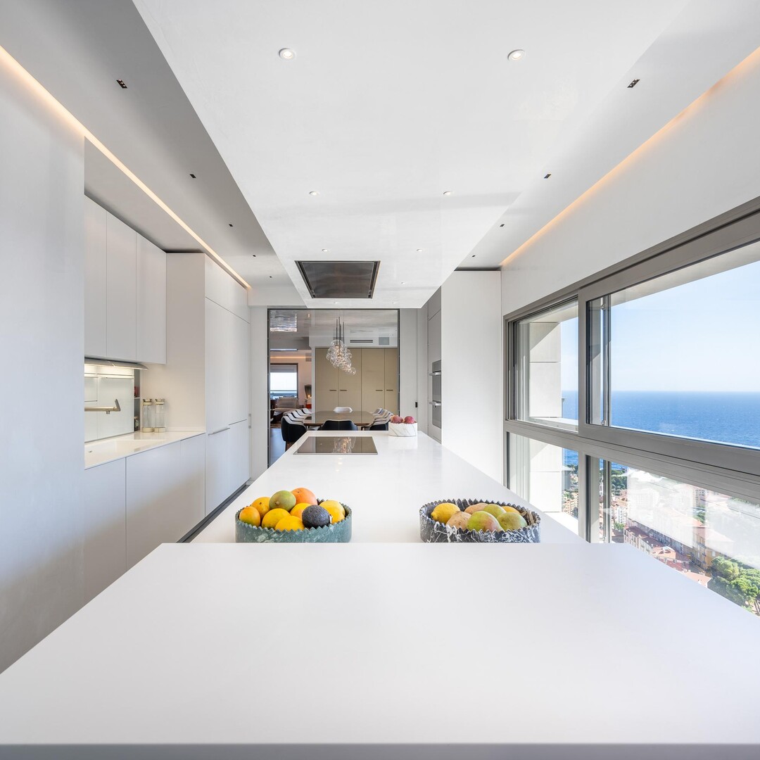 L’appartamento offre un ampio spazio abitativo con un soggiorno che si apre su una grande terrazza, regalando una vista panoramica mozzafiato sul Principato, sul Palazzo del Principe e sull’infinito blu del Mar Mediterraneo.